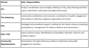 Submitted evidence and testimony will be processed and prioritised by the CAJ and PILS, in coordination with partners, panellists and in line with the Terms of Reference.